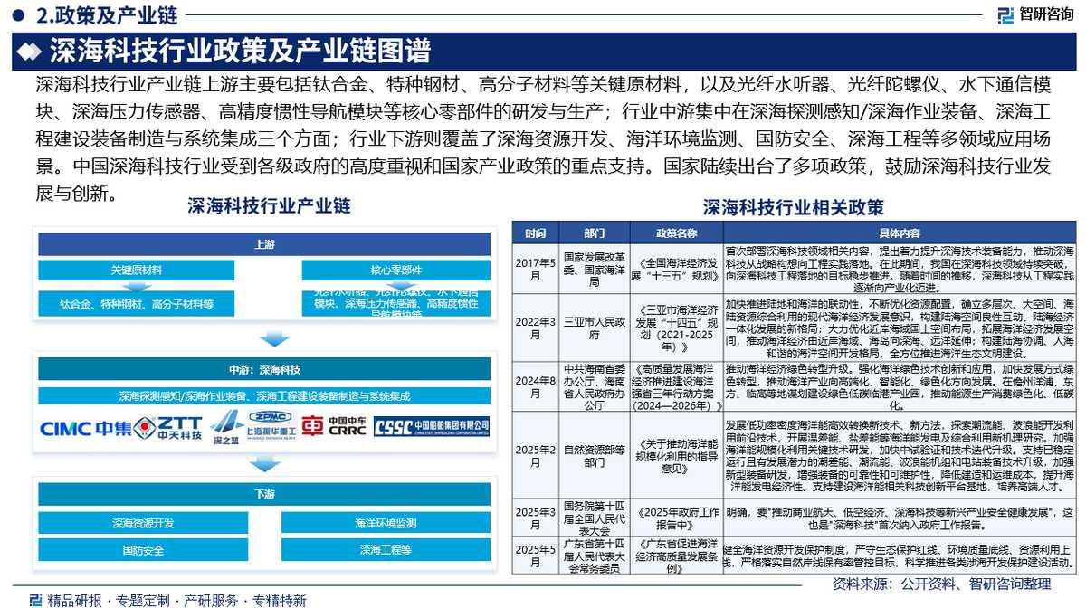 行业政策环境:中国深海科技行业受到各级政府的高度重视和国家产业政策的重点支持。国家陆续出台了多项政策,鼓励深海科技行业发展与创新。2025年《政府工作报告》中提出,要“推动商业航天、低空经济、深海科技等新兴产业安全健康发展”,这是首次将深海科技写入政府工作报告之中。