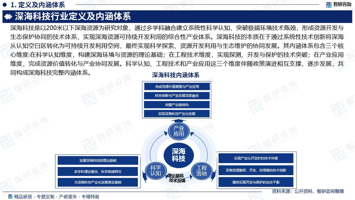 行业定义及维度:深海科技是以200米以下深海资源为研究对象,通过多学科融合建立系统性科学认知,突破极端环境技术瓶颈,形成资源开发与生态保护协同的技术体系,实现深海资源可持续开发利用的综合性产业体系。其内涵体系包含三个核心维度:在科学认知维度,构建深海环境与资源的理论基础;在工程技术维度,实现探测、开发与保护的技术突破;在产业应用维度,完成资源价值转化与产业协同发展。