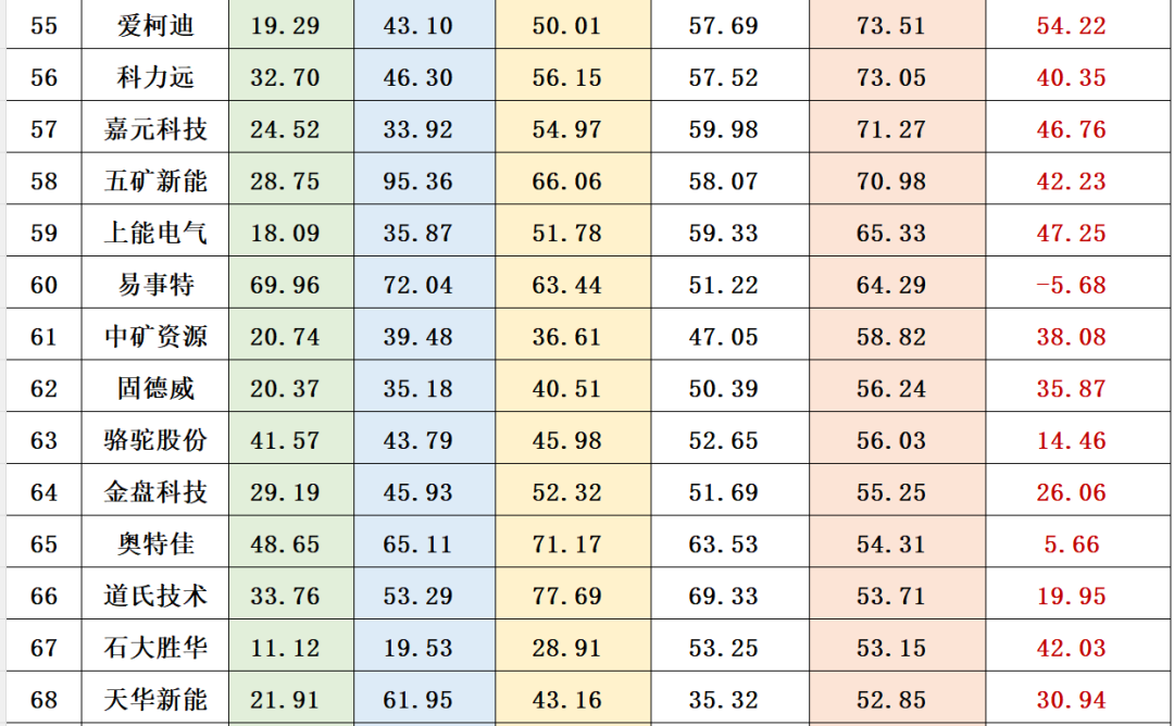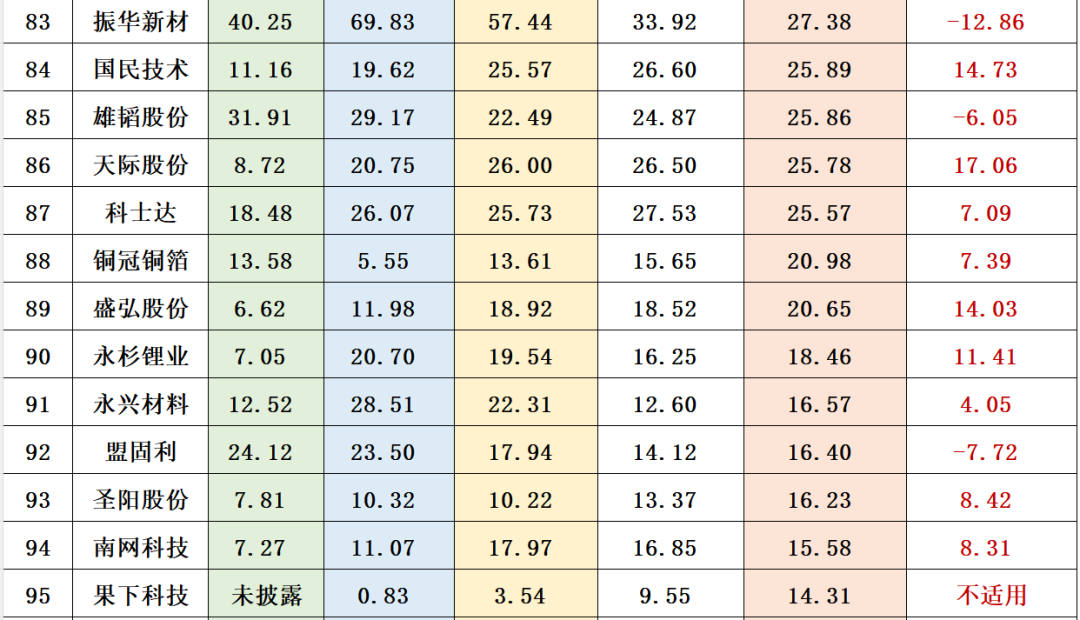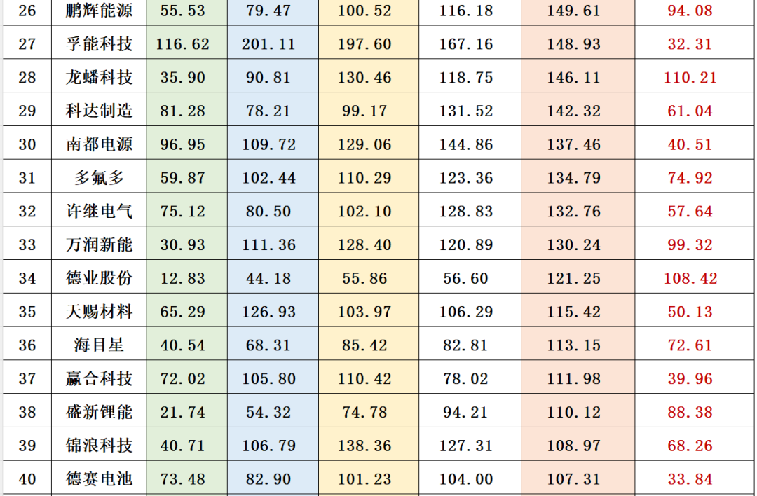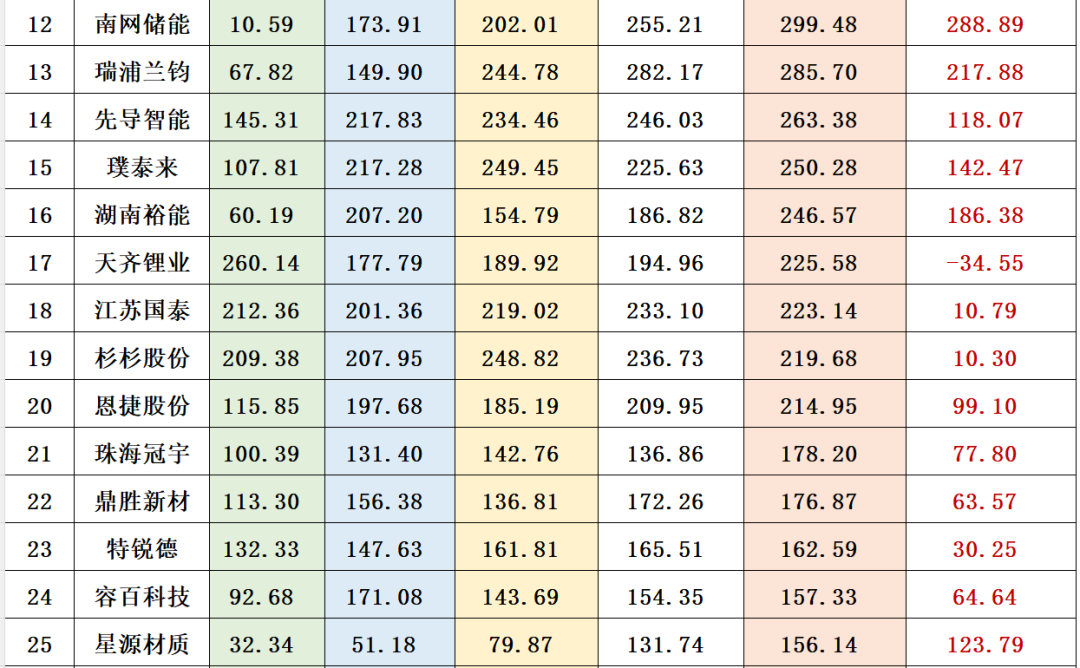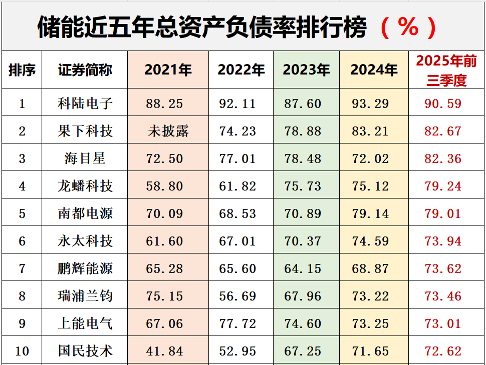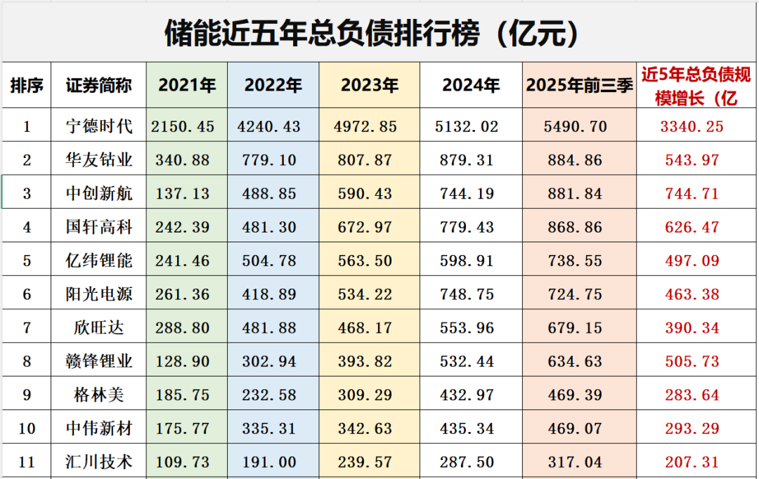 我们看总负债规模排在前列的企业,宁德时代2021年为2150亿,2025前三季为5490亿;华友钴业2021年为341亿,2025前三季达到544亿;中创新航2021年为137亿,2025前三季为882亿;国轩高科2021年为242亿,2025前三季飙升到了868亿;2021年为241亿,2025前三季达到738亿。