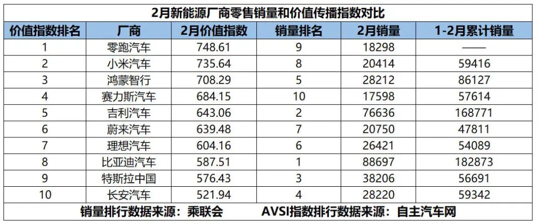 二月新能源市场的价值传播榜单,打破了销量决定声量的传统逻辑,价值与销量的深度错位,成为当下新能源市场竞争进入深水区的直接体现。零跑汽车以748.61的2月价值指数一举拿下价值榜榜首,成为本月最大黑马,但其二月销量仅18298辆位列第九,高声量与低销量形成鲜明对比,却也印证了其在品牌价值传播与用户心智占领上的成功;小米汽车紧随其后,以735.64的价值指数位居第二,20414辆的二月销量排名第八,1-2月累计销量59416辆,作为新能源赛道的新锐,凭借跨界流量与精准营销,持续在价值传播上保持高位。