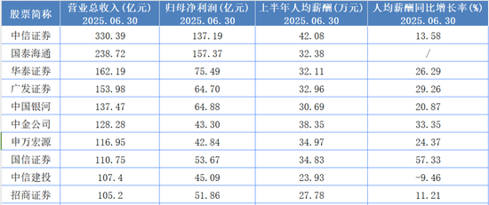 具体来看,根据半年报可查信息和”员工人均薪酬=(支付给职工以及为职工支付的现金+期末应付职工薪酬-期初应付职工薪酬)/期初期末员工平均人数”公式计算,上半年营收前十的券商,除了中信建投人均薪酬继续下降,以及新合并而来的国泰海通外,其他8大券商统统涨薪。申万宏源上半年人均薪酬为34.97亿元,同比上涨24.37%。涨薪幅度不算小。