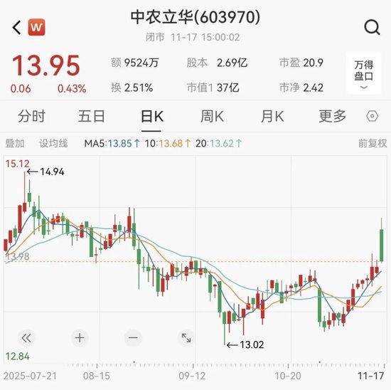 截至11月17日收盘,中农立华股价报13.95元/股,总市值为37亿元。