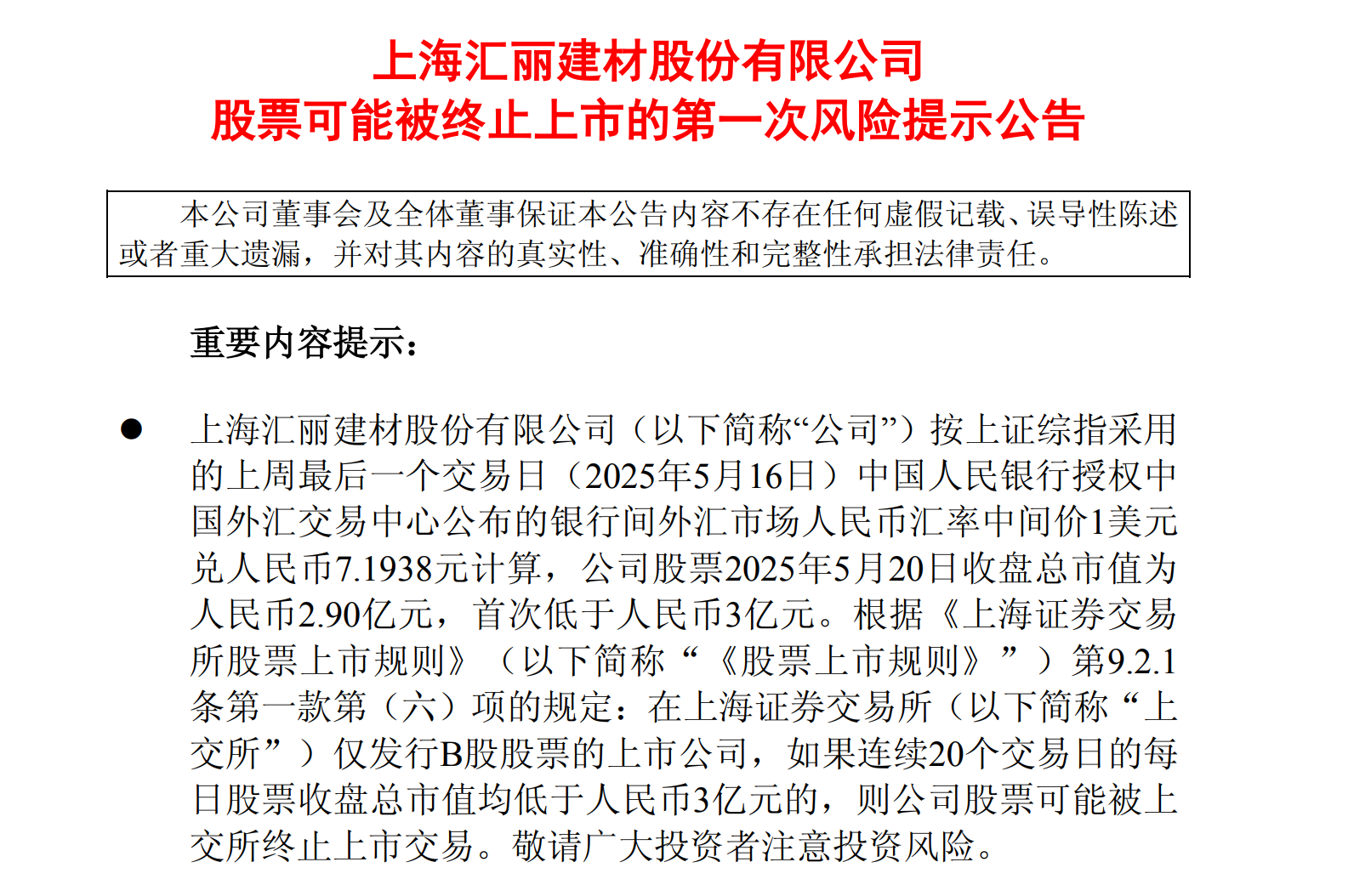 5月20日晚间,汇丽 B发布公告称,根据《股票上市规则》第9.2.1条第一款第(六)项的规定:在上交所仅发行B股股票的上市公司,如果连续20个交易日的每日股票收盘总市值均低于人民币3亿元的,则公司股票可能被上交所终止上市交易。
