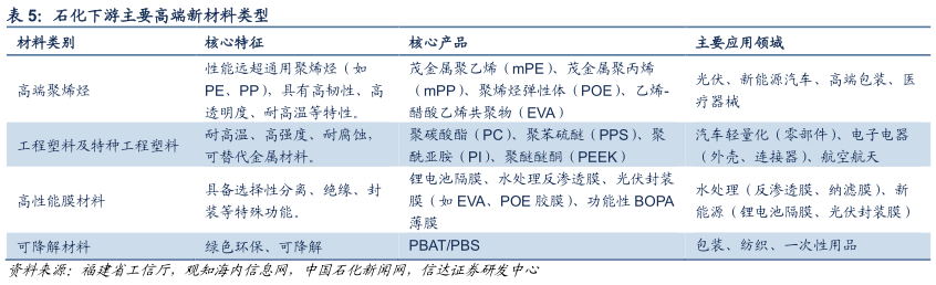 石化下游高端新材料是指具有高技术含量、高应用性能、高市场价值等特性,应用于高技术领域和战略性新兴产业的石化化工材料。与传统大宗石化产品相比,其技术壁垒高、附加值高、成长性好,石化高端新材料是石化产业面向精细化、高端化发展的关键标志。根据中国石化经济技术研究院数据,2024年我国高性能材料自给率仅54%左右,其中,关键单体及中间体自给率最低,高端聚烯烃市场份额最大,部分领域仍需加快发展。石化高端新材料主要可划分为高端聚烯烃、工程塑料及特种工程塑料、高性能膜材料和生物基及可降解塑料四大类。
