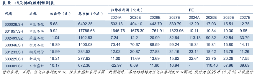 投资建议:我们重点推荐国营化工龙头企业中国石化(600028.SH)、中国石油(601857.SH);具备规模优势、化工产业链条长、高附加值产品布局丰富的民营大炼化企业:恒力石化(600346.SH)、荣盛石化(002493.SZ);逐步增强产业链协同优势的涤纶长丝龙头桐昆股份(601233.SH)、新凤鸣(603225.SH);建议关注:东方盛虹(000301.SZ)。