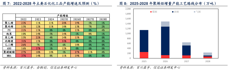 石化化工品中,烯烃扩能短期延续,芳烃扩能或迎来“真空期”。我们统计了部分主流石化化工产品的未来增量产能情况,根据百川盈孚数据,未来1-2年仍是聚烯烃产能释放期,产能主要来自油制路线,供给端增速仍保持较高水平;而部分芳烃产品或在2025-2026年出现投产“真空期”,如2025年PX暂无新增产能释放,2026年纯苯增量产能增速明显收窄。总体上看,我们预计石化化工产品扩能或在2027年前后完成收尾,而在2025-2026年部分化工产品供给侧将出现结构性机遇。