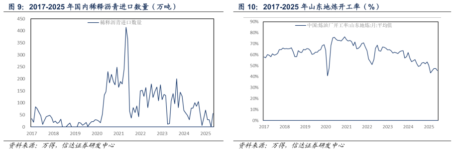 税改背景下,地炼成本压力攀升倒逼落后产能出清。受美国对委内瑞拉制裁影响,中石油在2019年8月宣布暂停自委内瑞拉进口原油,导致沥青型炼厂的委内瑞拉马瑞原油供应量骤降。在此背景下,稀释沥青的进口迎来上升期,2020年4月后进口量显著抬升。2021年5月财政部、海关总署、税务总局发布公告,自2021年6月12日起,对部分成品油视同石脑油或燃料油征收进口环节消费税,公告主要涉及3个品种,分别是混合芳烃、轻循环油和稀释沥青,稀释沥青的进口量大部分被生产沥青的独立炼厂所消耗。根据百川盈孚数据,山东省计划自2024年10月起对于以燃料油、稀释沥青和石脑油作为原料进行加工生产的企业,按应税产品占比计算准予扣除的数量,前期的税收政策实行下,该部分原料的进项消费税可以实现100%抵扣,而此次税改以后,根据钢联能化预测,抵扣比例或将下降50%-60%,对于地方炼厂来说,成本方面或上升450-600元/吨,利润空间受到明显挤压。根据万得数据,自2021年稀释沥青征收消费税后,国内进口稀释沥青数量高位回落,而2024年10月的税改要求进一步抬升了以稀释沥青为主要原料的炼厂成本,加剧稀释沥青进口量下滑,2025年1-5月,国内进口稀释沥青合计186万吨,较去年同期下滑34%。此外,受原料成本抬升影响,山东地炼开工负荷自2021年开始持续下滑,2025年6月山东地炼开工负荷仅45%左右。我们认为,燃料油和稀释沥青的税改问题对地方炼厂影响较大,进一步推升的经营成本也将持续压缩落后产能的生存空间,尽管这一进程可能在政策执行过程中有所反复,但料将持续倒逼其产能出清加速。