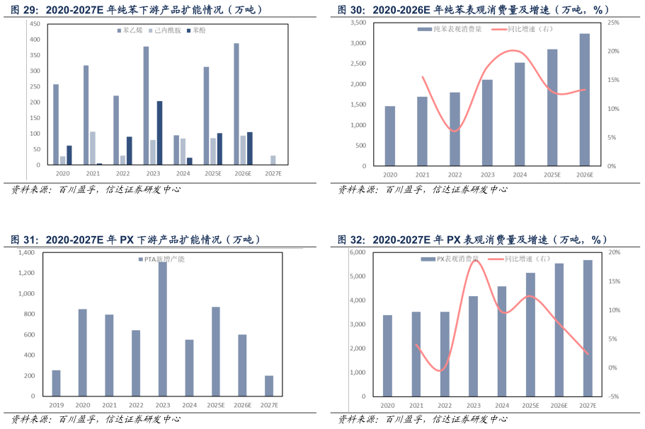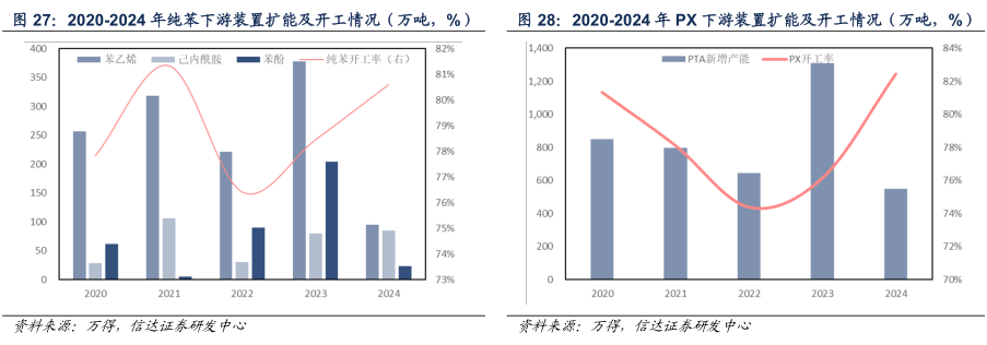 芳烃下游扩能带动芳烃产品开工负荷提升。纯苯和PX作为下游化工品生产的中间产品,其直接需求主要来自下游化工装置。我们统计了纯苯主要下游产品苯乙烯、己内酰胺、苯酚等历史产能增量和PX下游PTA产品的历史产能增量,并与纯苯和PX开工负荷进行比较,从过去历史芳烃下游增量产能和芳烃开工率来看,下游扩能将刺激芳烃需求进而提升芳烃开工负荷。