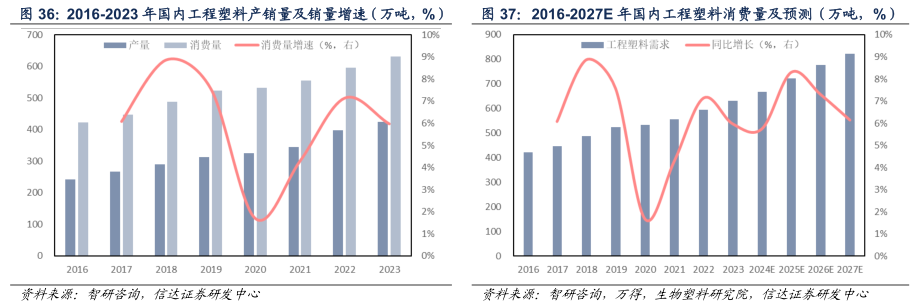 工程塑料、锂电隔膜:新能源汽车产业带来强劲需求拉动。工程塑料的轻量化、高强度等性能使其在汽车、电子、建筑、机械及航空航天等领域具有广泛应用,近年来,受益于国内新能源汽车快速发展,叠加新能源汽车较传统燃油车塑料用量更高,推动工程塑料需求量提升。我们对未来国内工程塑料需求进行预测:1)单车塑料用量:根据生物塑料研究院数据,传统燃油车塑料消耗均值145公斤,新能源车则超过180公斤,扣除PP、PE等大宗塑料产品占比,工程塑料占比约73%;2)汽车产量:2025年1-9月国内汽车总产量同比增长11%,假设2025年汽车总产量增速10%,2026-2027年产量增速年均下降2pct,2025年1-9月国内新能源汽车总产量同比增长30%,假设2025年新能源汽车总产量增速30%,2026-2027年产量增速年均下降5pct;3)其它领域工程塑料消费量:以2020-2023年平均增速4%为基准,2025-2027年保持不变。根据我们测算,我们预计2025-2027年国内工程塑料消费量年均增速在6-8%,新能源汽车有望对工程塑料需求带来强劲拉动。