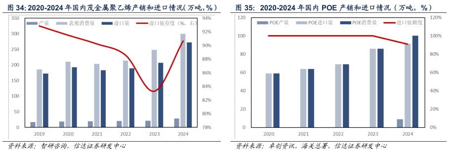 高端聚烯烃:进口替代正当时。茂金属聚烯烃、聚烯烃弹性体等高端聚烯烃产品上产速度偏缓,进口依赖度仍保持较高水平。茂金属聚乙烯方面,在国内消费扩张和高端包装等需求刺激下,2024年茂金属聚乙烯表观消费量约达300万吨,同比增长21%,但进口量高达272万吨,进口依赖度高达91%。聚烯烃弹性体方面,过去POE产品长期依赖进口,直到2023年12月国内首套工业化装置才投产,根据海关总署数据,2024年国内POE进口量仍高达91万吨,进口依赖度超过90%,而近年来受益于光伏、新能源汽车等下游需求扩张,2021-2024年POE消费量平均增速高达14%,高端聚烯烃方面或存在新兴产业带来的需求扩张与国内产能自给不足的供需错配局面。