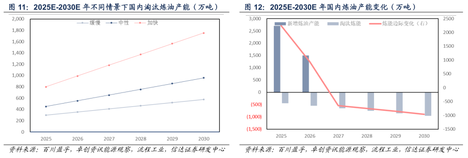 潜在炼能淘汰规模庞大,行业有望逐步进入存量竞争时代。回顾历史炼能淘汰情况,在前述政策指引下,近年来国内炼能淘汰项目主要集中于100-300万吨产能,根据百川盈孚数据,当前全国300万吨及以下炼油产能合计约7662万吨,我们认为该类中小型炼厂均有面临淘汰可能。我们分偏缓、中性、加快三种炼能淘汰情景进行假设并展望至2030年,根据我们统计,200万吨以下、250万吨以下、300万吨以下炼油产能分别为2620、4222、7662万吨,在偏缓淘汰情景下,假设2030年前200万吨以下产能淘汰完毕;在中性淘汰情境下,假设2030年前250万吨以下产能淘汰完毕;在加快淘汰情景下,假设2030年前300万吨以下产能淘汰完毕。考虑到近年来产能约束、淘汰出清政策趋严,假设炼能淘汰数量每年线性增长。我们结合计划投产的新增炼能,预计未来国内炼能边际增量将逐步趋缓,行业或将步入存量竞争时代。