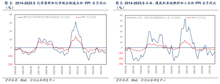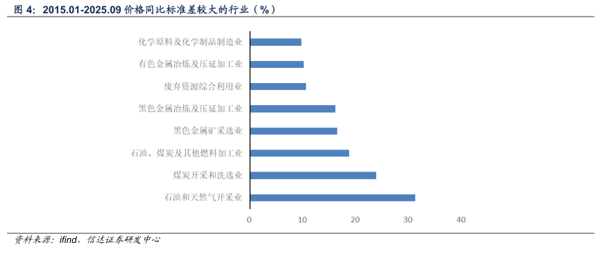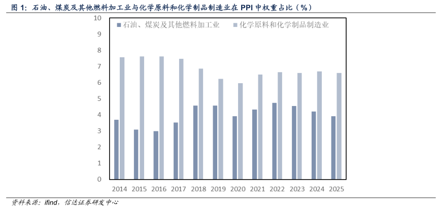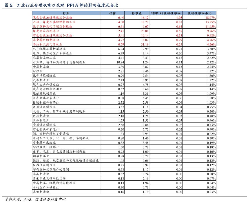 石化产品价格波动率高,叠加其权重较高,对PPI走势具有重要影响。权重高低并非决定行业对PPI走势影响程度的唯一因素,PPI增速的波动性差异也同样关键,通过计算各行业2015年以来价格同比的标准差,并乘以对应权重,可量化各行业对PPI的实际影响程度。从行业价格波动率看,各行业价格波动最大的为石油和天然气开采业,其标准差较大主要系国际油价波动影响,但我国对原油等国际大宗商品的定价权相对较弱。石油、煤炭及其他燃料加工业和化学原料及化学制品制造业的价格变化标准差分别为18.77和9.67,将标准差乘权重,二者在全行业中对PPI波动性影响合计占比达到25%,石化产品价格变化是PPI的重要影响因素。