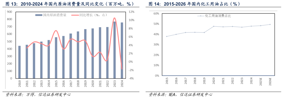 国内石油消费结构转变或进一步深化。受成品油达峰影响,2024年国内石油消费为近年来首次负增长,与之对应的化工用油消费仍保持增长,根据IEA数据,2024年中国化工用油消费量为796万桶/天,同比增长3%。受国内成品油消费达峰和化工用油消费增长影响,国内石油消费结构转变进一步深化,2024年国内化工用油消费占石油消费约48%,我们预计到2026年国内化工用油消费占比有望提升至50%,国内石油消费结构转变或将进一步深化,化工用油或成为国内石油消费增长的核心动力。