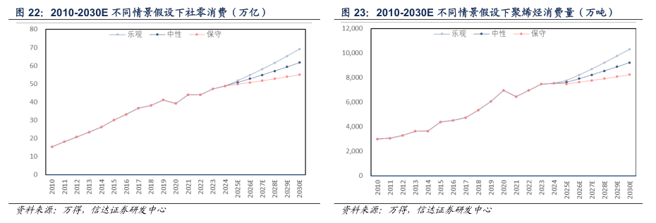 我们通过预测未来社零消费增速和规模来对聚烯烃消费增速进行预测。我们分别做了乐观、中性和保守三种情景假设,并剔除了2020年疫情背景下的特殊影响。我们发现从“十一五”至“十四五”期间,社零消费增速中枢在不同阶段均有所下行,但降幅逐步收窄,“十四五”以来社零消费增速中枢约6%,较“十三五”下降2pct,我们以“十五五”阶段社零增速较“十四五”下降2pct作为中性假设,即4%;乐观假设下,假设社零增速与“十四五”一致,即6%;保守假设下,社零消费增速大幅下降,降幅与“十一五”至“十二五”增速中枢降幅4pct一致,即社零消费增速仅2%。根据我们测算结果,在中性假设下,我们预计2025-2030年聚烯烃表观消费增速在1-4%左右。