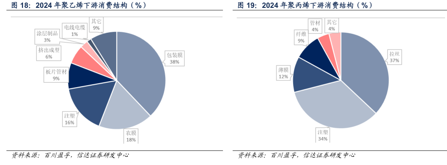 聚乙烯和聚丙烯作为两大通用塑料,因分子结构和性能差异,下游应用领域略有区别。聚乙烯材料主要用于膜类产品,包装膜和农用薄膜占比超过50%,多为一次性消费品,常用于日常生活和农业领域,其次为注塑、板片管材等,主要应用于日常生活和地产行业;聚丙烯下游主要用于拉丝、注塑等领域,终端应用领域主要涉及水泥、化肥及粮食等产品包装、汽车、家电以及地产行业等,总体来看,我们认为聚烯烃下游应用主要来自地产基建及居民日常消费。