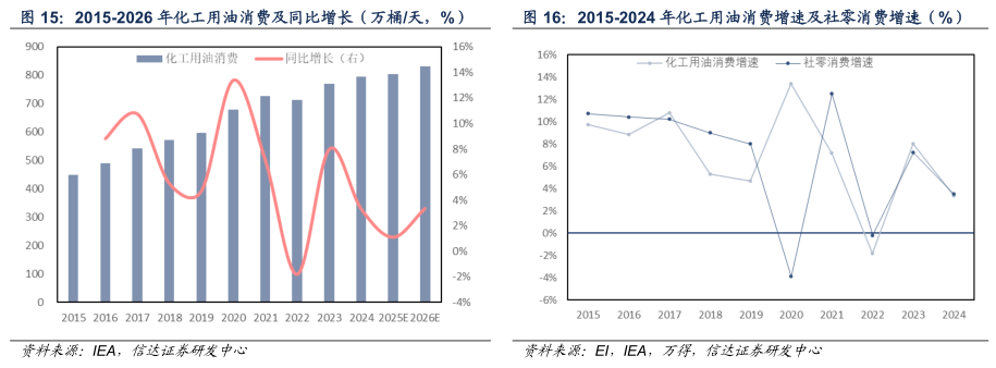 化工用油需求仍处于长期增长通道中,缓慢复苏或成为需求增长主基调。从化工用油实际消费量角度看,因我国人均化工品消费量总体仍较低,当前正处于持续提升阶段,除2022年因疫情抑制国内经济活动,导致需求阶段性下跌外,近年来整体保持稳健增长。根据IEA预测,2025-2026年国内化工用油需求年均增速约1%-4%,整体保持缓慢复苏态势。此外,剔除2020年疫情因素影响,近年来社会零售品消费增速与化工用油消费增速变化存在一致性,在促消费相关政策支持下,当前社零消费保持稳步复苏态势,也有望进一步支撑化工用油需求,石化化工品需求或仍处于长期增长通道。