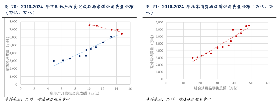 扩大内需背景下,聚烯烃表观消费仍保持增长。2024年底,中央经济工作会议将“大力提振消费、提高投资效益,全方位扩大国内需求”列为2025年9项重点任务之首,消费在内需扩大的重要性更加突出。近年来由于国内地产复苏疲软,对聚烯烃需求拉动有限,居民消费成为聚烯烃需求增长关键力量。我们比较了历史地产投资和社零消费对聚烯烃需求的拉动影响,从二者的数据分布可以看出,近年来地产投资有所下行,其对聚烯烃消费拉动偏弱,而社零消费仍保持增长,并与聚烯烃消费量变化保持较高的正相关性。在扩大内需背景下,聚烯烃消费量有望保持增长。