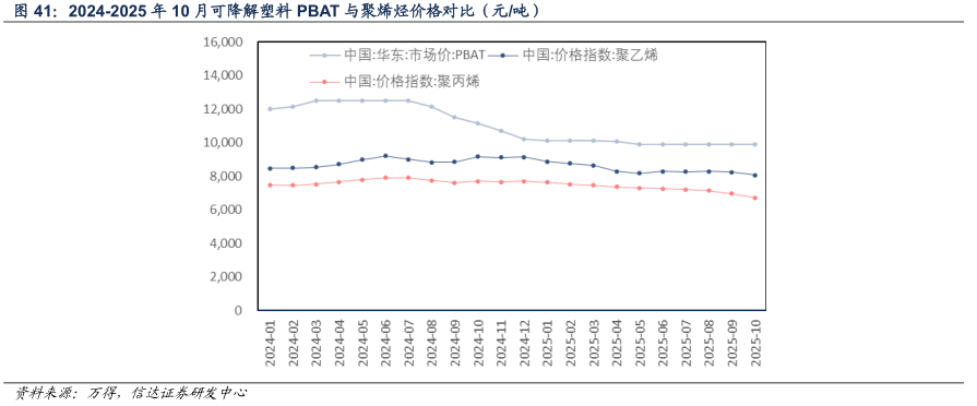 可降解塑料:“限塑令”推动市场空间打开,但价格是当前市场扩张的主要制约。政策方面,早期的“限塑令”更侧重于限制超薄袋和有偿使用,2020年的新规更强调对不可降解塑料制品的禁止和限制,覆盖的产品种类和领域更广,进一步拓宽了可降解塑料的市场容量。价格方面,以石油基可降解塑料PBAT为例,当前PBAT单吨价格较传统的聚乙烯、聚丙烯产品高约20-50%,对其市场渗透带来一定制约。我们认为,未来可降解塑料需求改善主要来自两大方面,一是规模化装置投产后带来的成本压降,进而降低产品价格,提高产品市场竞争力;二是政策端方面进一步强化约束和监管。