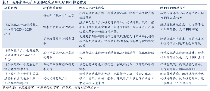 政策端协同发力,有望推动石化产品价格回暖,进而助力PPI企稳回升。近年来政策端持续发力,其中关键着力点为推动PPI企稳上行,从政策体系看,短期通过供给侧“反内卷”治理快速优化市场秩序,中期靠需求侧刺激拓展市场空间,长期则包括石化行业在内的重点产业通过创新驱动实现高质量发展。对石化产业而言,政策端核心抓手在于推动“供给端优化”与“需求端扩张”协同发力,供给侧方面,通过严控新增炼油产能,科学调控乙烯、对二甲苯等大宗产品产能投放节奏、推动落后炼油产能出清等手段实现石化行业“反内卷”治理;需求侧方面,通过组织石化化工产品供需对接活动,挖掘建筑、汽车、船舶等传统领域消费潜力,培育新能源、低空经济、人形机器人等新兴领域应用场景,拓展石化产品市场需求,激发市场潜能。