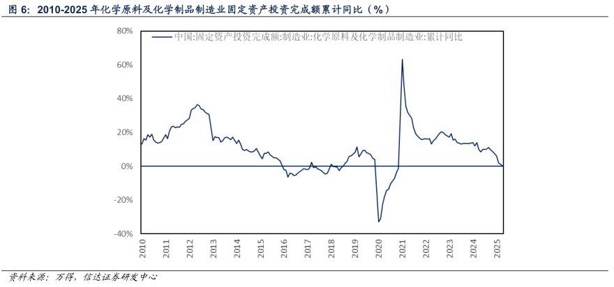 化工品资本开支放缓,行业转型升级加速。从投资角度看,2021年中国一批大型炼化一体化项目集中投产,2022年以来新增产能投放速度有所放缓,受益于近年来炼化行业扩能放缓,叠加“双碳”政策以及化工行业高质量发展推动,化工品资本开支明显放缓,行业由“规模红利”向“价值红利”阶段升级。2025年5月化学原料及化学制品制造业固定资产投资完成额累计同比增长仅0.4%,供给增量释放明显放缓。