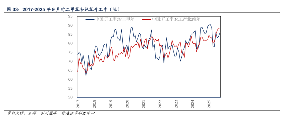 下游装置扩能仍在继续,芳烃需求端有望持续修复。根据百川盈孚数据,我们统计了2025-2026年纯苯和PX下游新增产能情况,2025-2026年仍是芳烃下游产品装置投产的密集期,我们以原料单耗测算下游产品产能增量对纯苯和PX产品的需求边际增量,根据我们测算,伴随下游装置产能扩张,仅考虑苯乙烯、己内酰胺和苯酚产品的情况下,我们预计2025-2026年纯苯的边际需求增量均为13%左右;考虑下游PTA装置扩能和单耗的情况下,我们预计2025-2026年PTA扩能对PX产品边际需求增量分别为12%、8%。2025年以来芳烃开工负荷仍保持较高水平,未来受益于下游装置产能扩张,芳烃板块需求或仍将保持较高增速。
