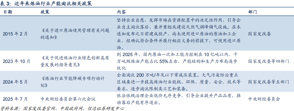 政策端强势推进落后炼能退出。从“十三五”至“十四五”阶段,国家政策端对炼化落后产能退出约束持续收紧,“十三五”阶段的落后产能出清主要来自原料资源获取推动,多出于政策鼓励和企业自愿;“十四五”阶段产能出清主要基于“双碳”目标等环保政策约束,多出于约束性与强制性,不仅在行业供给总量做了10亿吨炼化产能“天花板”限制,同时推动不符合国家产业政策的200万吨/年及以下常减压装置有序淘汰退出。2025年5月国家发改委再次强调,要加快淘汰炼油等行业低效落后产能,优化产业布局,遏制落后产能无序扩张;“反内卷”政策加码,2025年7月中央财经委员会第六次会议召开,会议强调,纵深推进全国统一大市场建设,要聚焦重点难点,依法依规治理企业低价无序竞争,引导企业提升产品品质,推动落后产能有序退出,国内落后炼油产能存在高能耗、产品单一、高端产品不足等多特征,中央密集释放“反内卷”信号,或推动落后炼能加速退出,拥有深加工、一体化、高端化的先进民营炼化一体化有望优先受益。