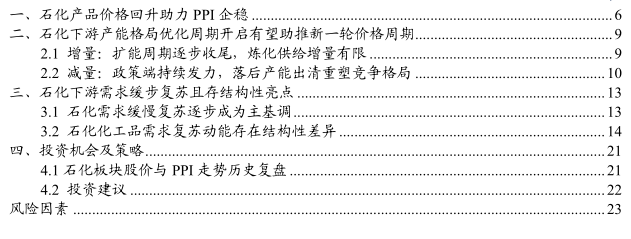 综上,我们认为,石化产品在PPI的构成中具有权重占比高、波动性强等特点,石化产品价格变化与PPI走势具备强关联性,而近年来政策端持续发力,以“供给端优化”与“需求端扩张”为主要抓手,有望推动石化产品价格回暖,进而助力PPI企稳回升。