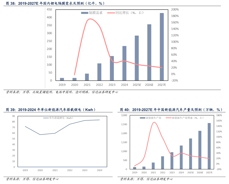 锂电隔膜需求空间测算:1)单车搭载锂电:我们根据2019-2024年国内锂电池产量数据和新能源汽车产量数据测算,近年来单车搭载锂电池呈现稳步提升趋势,我们假设2025-2027年单车搭载锂电与2024年保持一致;2)新能源汽车产量:与前文预测保持一致;3)单位动力电池隔膜消费量:根据北极星储能网、行业龙头沧州明珠数据,1GWh的动力电池约消耗2000万平方米隔膜。2024年国内锂电隔膜消费量约219亿平,同比增长41%,根据我们测算,预计2025-2027年国内锂电隔膜消费量增速略有放缓,但仍将保持20-30%的高增速。