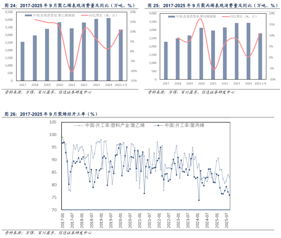 受制于供给释放,聚烯烃开工负荷提升偏缓。近年来受民营大炼化投产、轻烃裂解项目上马,聚烯烃保持较高的产能增速,2018-2024年产能平均增速为12%,2020年后产能增速高于表观需求增速。截至2025年9月,国内聚烯烃产能为8866万吨,同比增长17%,表观消费量6710万吨,同比增长11%,表观消费量的高增速主要系新装置带来的产量释放。根据我们在《2025年石化行业年度策略报告——炼化周期筑底,景气复苏可期》的结论,大宗化学品景气度与开工率同频,而在供给侧增量释放、实际需求增长有限背景下,近年来聚烯烃产品开工负荷提升相对偏缓。