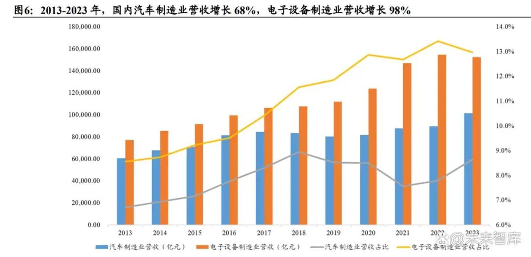 汽车、电子及新能源(锂电和光伏)是中国工业机器人下游最广泛的三个行业, 也是高度资本密集型行业。近 10 余年,这些行业营收和产量大幅提升,资本性支 出高增,由此显著拉动了整体机器人需求的爆发。 数据来看,2013-2023 年,国内汽车制造业营收增长 68%,制造业占比从 6.7%增 长至 8.6%;电子设备制造业营收增长 98%,制造业占比从 8.6%增长至 13.0%;光 伏年新增装机量增长超过 15 倍,锂电池总产量增长超过 26 倍。