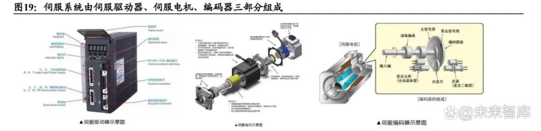 伺服系统是工业机器人主要的动力来源,由伺服驱动器、伺服电机、编码器三部 分组成。数控机床也是伺服系统下游的主要行业之一。
