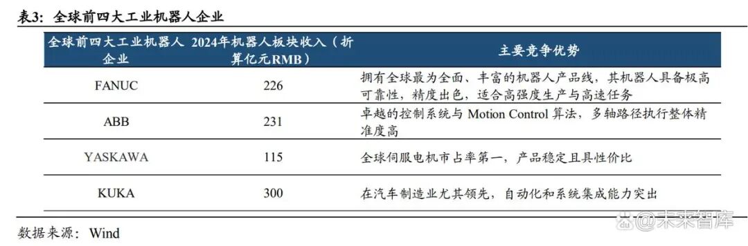 但从销售额和高价值量机器人出货量统计,国产厂商较国际头部企业尚存在差距。 结合公司年报数据和 MIR DATABANK 的出货量数据分析,以 2024 年全年为例, 国内工业机器人出货量 29.4 万台,发那科中国区收入合计 90 亿元,出货量占比 11%,单台/套价值量 27.8 万元;埃斯顿销售收入合计 40 亿元,出货量占比 9.4%, 单台/套价值量 14.5 万元,仅为发那科的一半。我国工业机器人企业的出货主要集 中在轻负载机器人领域,国产化率已然很高、且全球竞争优势明显,但在技术门 槛高、价值量大的重载机器人领域,国内替代空间仍然较大,难度也更高。