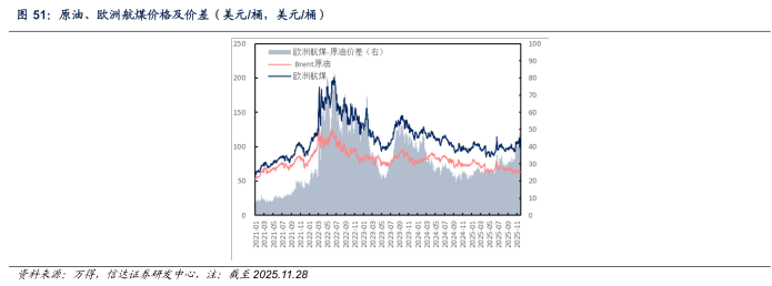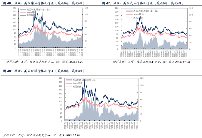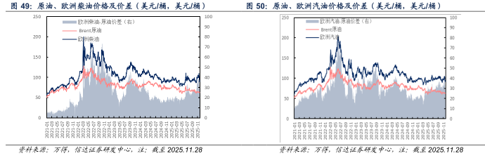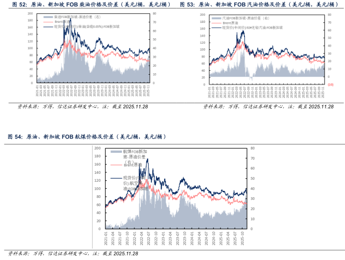 欧洲市场:截至2025年11月28日当周,欧洲柴油、汽油、航煤周均价分别为92.74(-11.87)、93.77(-7.22)、98.79(-9.52)美元/桶;与原油差价分别为29.56(-11.20)、30.59(-6.55)、35.61(-8.85)美元/桶。