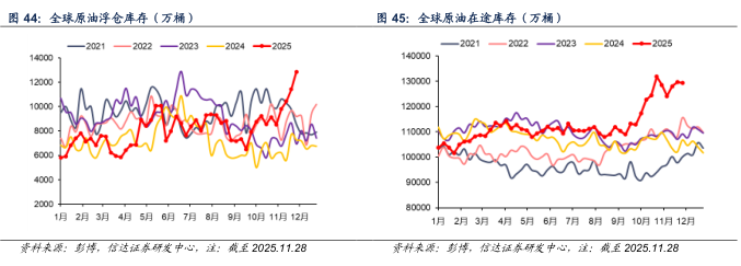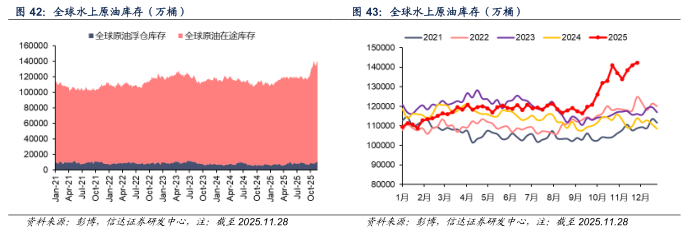 截至2025年11月28日当周,全球原油水上库存(包括在途和浮仓)为14.23亿桶,较上周+1236.8万桶(+0.87%)。其中,全球原油浮仓库存为12859.4万桶,较上周+1436.8万桶(+11.17%);全球原油在途库存为12.94亿桶,较上周-200万桶(-0.15%)。