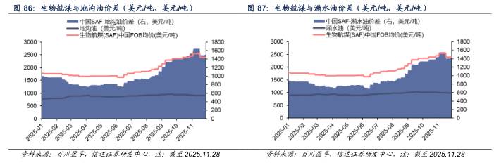 生物航煤价格及价差:截至2025年11月28日,中国生物航煤港口FOB价格为2400美元/吨,较上周五价格持平,与地沟油、潲水油价差分别为1494.77、1417.50美元/吨,较上周五价差分别+4.55、+9.81美元/吨。欧洲生物航煤港口FOB价格为2670美元/吨,较上周五价格-280美元/吨。