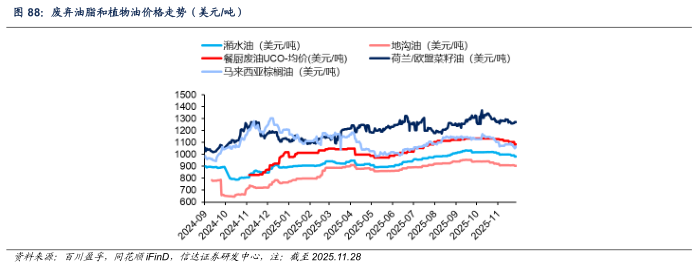 原料油价格:截至2025年11月28日,中国地沟油、潲水油价格分别为905.23、982.50美元/吨,较上周五价格分别-4.55、-9.81美元/吨,中国餐厨废油UCO价格为1085美元/吨,较上周五价格-20美元/吨。