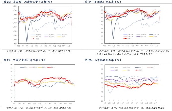 美国炼厂:截至2025年11月21日当周,美国炼厂原油加工量为1644.3万桶/天,较上周增加21.1万桶/天,美国炼厂开工率为92.30%,较上周上升2.3pct。