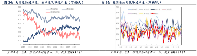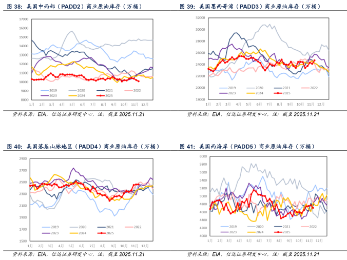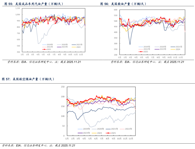 产量方面:截至2025年11月21日当周,美国成品车用汽油、柴油、航空煤油产量分别为955.7、499.8、189.1万桶/天,较上周分别+28.6(+3.08%)、+8.7(+1.77%)、+3.3(+1.78%)万桶/天。