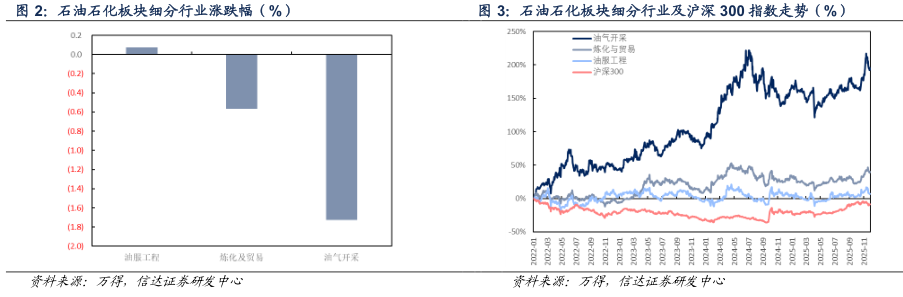 截至2025年11月28日当周,油服工程板块上涨0.07%,炼化及贸易板块下跌0.57%,油气开采板块下跌1.73%。