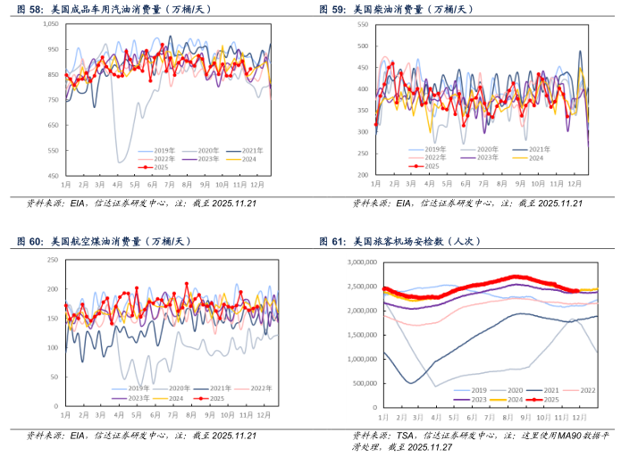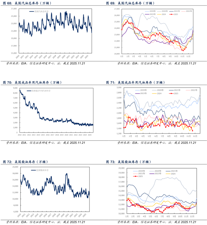 消费方面:截至2025年11月21日当周,美国成品车用汽油、柴油、航空煤油消费量分别为872.6、336.2、169.8万桶/天,较上周分别+19.8(+2.32%)、-52.0(-13.40%)、+2.9(+1.74%)万桶/天。