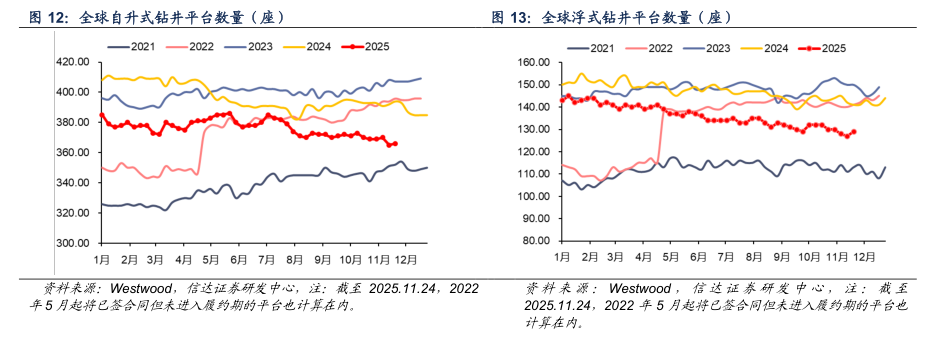 已有合同的钻井平台数量:截至2025年11月24日当周,全球海上自升式钻井平台数量为366座,较上周增加1座,其中东南亚、中东地区各增加1座,北美地区减少1座;全球海上浮式钻井平台数量为129座,较上周增加2座,其中东南亚、南美各增加1座。