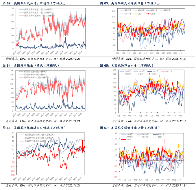 汽油板块:截至2025年11月21日当周,美国车用汽油进口量为6.9万桶/天,较上周减少9.8万桶/天(-58.68%);出口量为108.8万桶/天,较上周增加11.5万桶/天(+11.82%);净出口量为101.9万桶/天,较上周增加21.3万桶/天(+26.43%)。