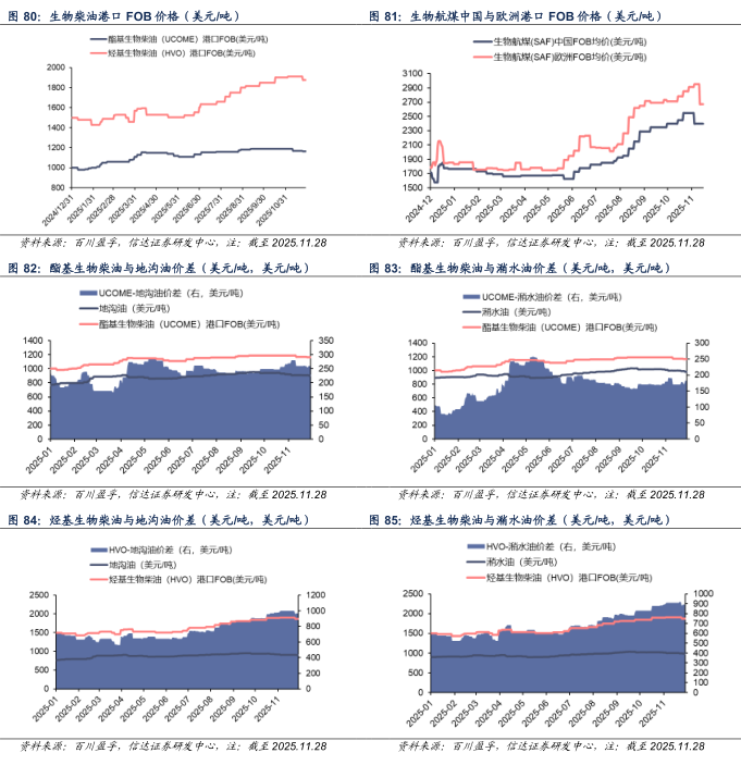【生物燃料价格】截至2025年11月28日,酯基生物柴油港口FOB价格为1165美元/吨,较上周五价格-5美元/吨。烃基生物柴油港口FOB价格为1875美元/吨,较上周五价格-35美元/吨。截至2025年11月28日,中国生物航煤港口FOB价格为2400美元/吨,较上周五价格持平。欧洲生物航煤港口FOB价格为2670美元/吨,较上周五价格-280美元/吨。截至2025年11月28日,中国地沟油、潲水油价格分别为905.23、982.50美元/吨,较上周五价格分别-4.55、-9.81美元/吨,中国餐厨废油UCO价格为1085美元/吨,较上周五价格-20美元/吨。