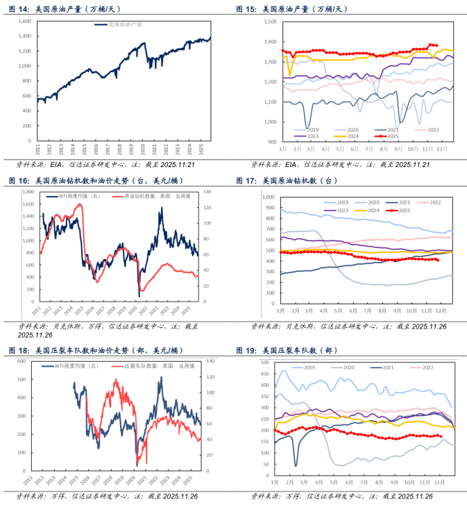 【美国原油供给】截至2025年11月21日当周,美国原油产量为1381.4万桶/天,较上周减少2.0万桶/天。截至2025年11月26日当周,美国活跃钻机数量为407台,较上周减少12台。截至2025年11月26日当周,美国压裂车队数量为173部,较上周减少6部。