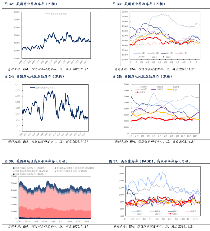 截至2025年11月21日当周,美国原油总库存为8.38亿桶,较上周增加327.2万桶(+0.39%);战略原油库存为4.11亿桶,较上周增加49.8万桶(+0.12%);商业原油库存为4.27亿桶,较上周增加277.4万桶(+0.65%);库欣地区原油库存为2175.3万桶,较上周减少6.8万桶(-0.31%)。