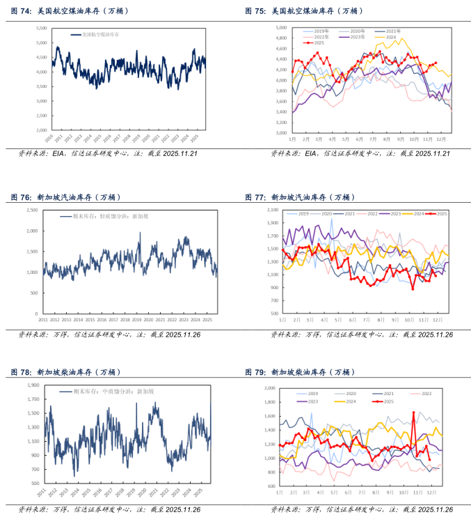航煤板块:截至2025年11月21日当周,美国航空煤油进口量为16.3万桶/天,较上周增加5.4万桶/天(+49.54%);出口量为30.4万桶/天,较上周增加2.7万桶/天(+9.75%);净出口量为14.1万桶/天,较上周减少2.7万桶/天(-16.07%)。