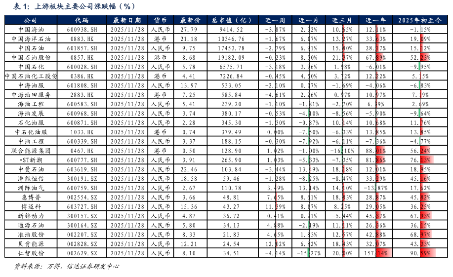 截至2025年11月28日当周,上游板块股价表现较好的是贝肯能源(+12.02%)、博迈科(+11.39%)、惠博普(+7.65%)。