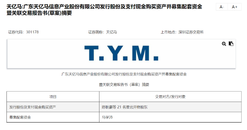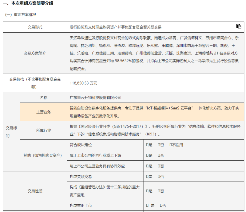 近期,广东天亿马信息产业股份有限公司(以下简称天亿马)正式披露收购广东星云开物科技股份有限公司(以下简称星云开物)98.5632%股权的草案。
