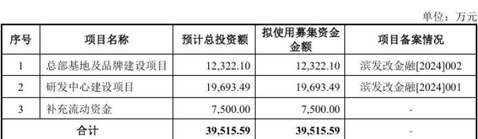 值得关注的是,在2024年末首度递表招股书中,公司计划募集资金3.95亿元,其中1.23亿元用于总部基地及品牌建设项目,研发中心建设项目金额不变,7500万元用于补充流动资金。