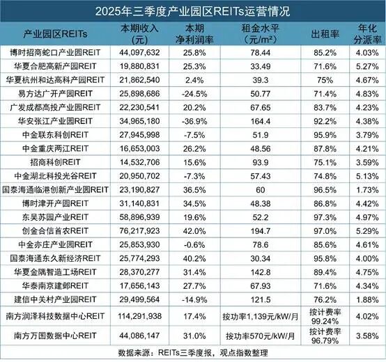 从市场整体表现来看,产业园区REITs指数累计下跌5.2%,平均年化收益率降至2.8%,较去年同期下降3.5个百分点,市场情绪与收益表现均面临阶段性压力。这一态势在三季度运营数据中得到充分印证,不同产品的财务与运营表现分化显著。